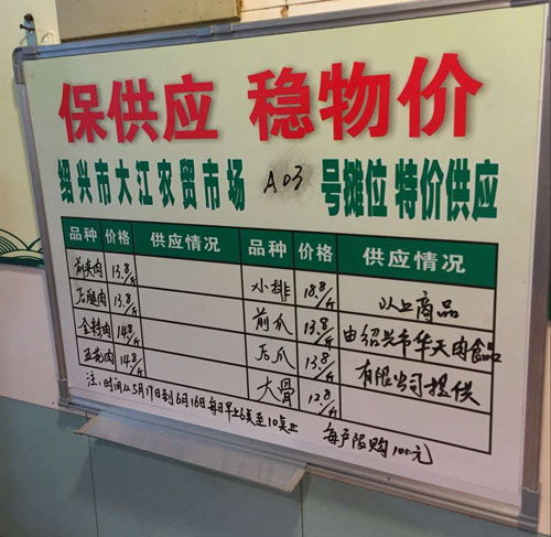 近期猪肉价格持续走高,5月继续上涨20%。为减轻市民“菜篮子”负担,市社下属绍兴市市场开发服务中心联合绍兴市区市场生猪产品管理办公室在越城区大江市场开展平价猪肉供应试点,由大江市场诚信经营户——绍兴市华天肉食品有限公司自发自愿提供平价生猪产品。由市农业局A级农产品质量安全信用企业——绍兴市北山牧业有限公司自发自愿提供羊肉,每斤价格也比其他摊位便宜3元左右。平价供应从5月17日持续到6月16日,为期一个月,供应时间为每天上午6点~10点,每天供应一头猪以上,每户限购100元。羊肉每天供应3只及以上,每户限购200元。下一步大江市场将继续通过摊位费优惠、考核加分等措施,引进产品安全质量信誉高的农产品种养殖企业,减少中间流转环节,为市民提供优质、低价的农产品。