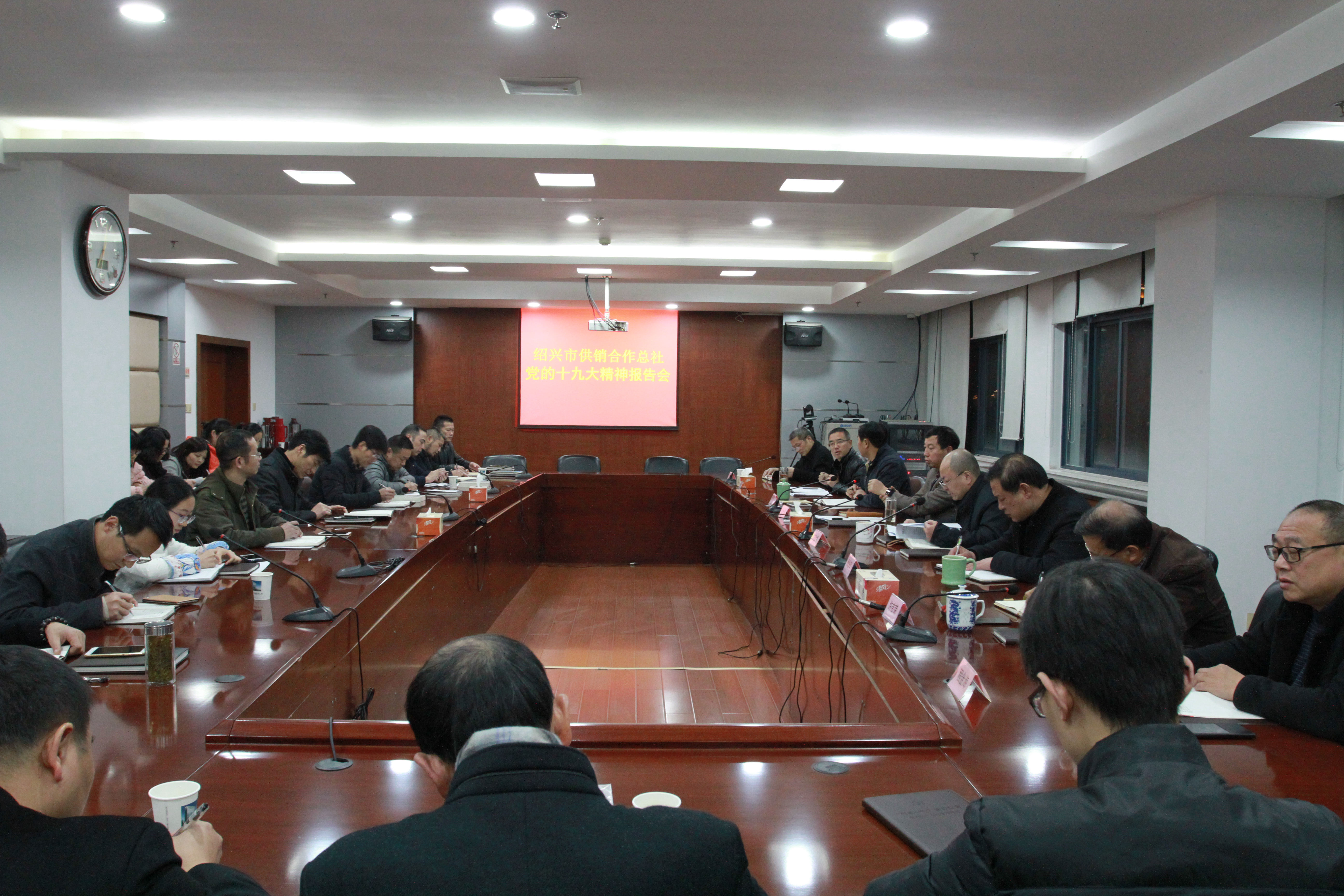 12月11日晚,市供销总社举行党的十九大精神报告会,市社党委书记、理事会主任王忠灵同志作党的十九大精神专题宣讲报告,市社全体机关干部,直属各单位党支部书记、支委委员共45人参加会议。